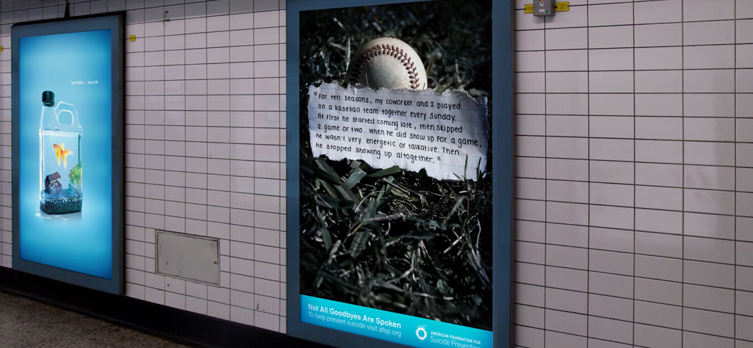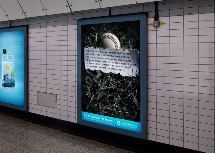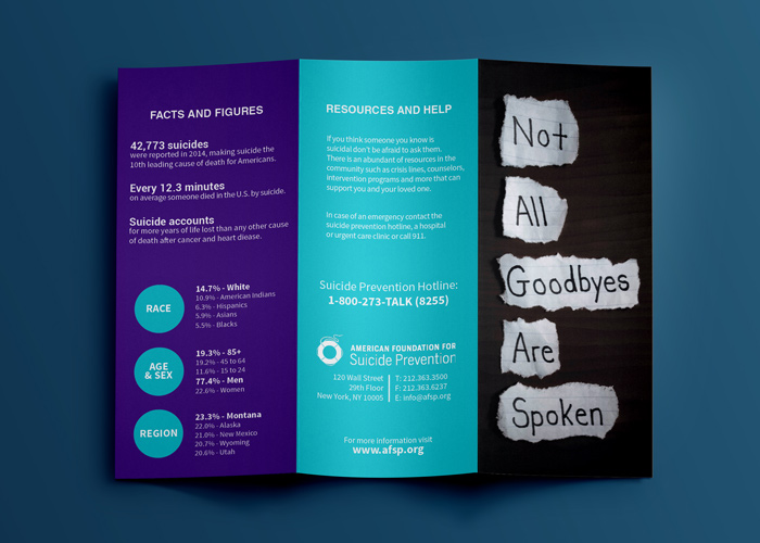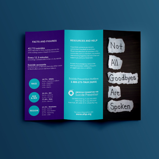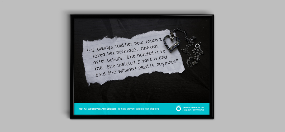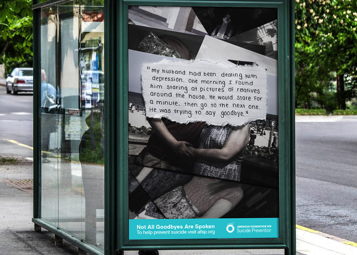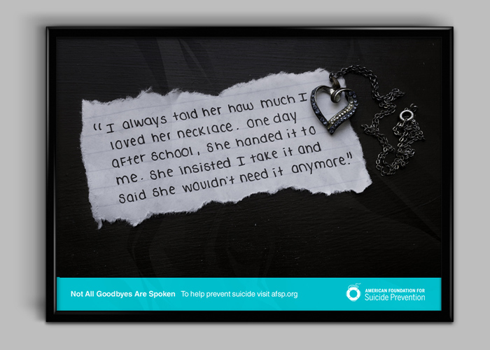 The American Foundation for Suicide Prevention is dedicated to saving lives and instilling hope through research, education, and advocacy. The campaign Not all Goodbyes are Spoken strives to empower the public through education of common suicidal warning signs. By utilizing quotes from people who lost someone to suicide, I depicted these warning signs in a relatable manner. Hand writing the quote on paper draws a parallel to suicide notes and emphasizes the common silence of a suicidal person. I visually enhance these quotes with the use of custom photography and technical editing to illicit an emotional response from the viewer.