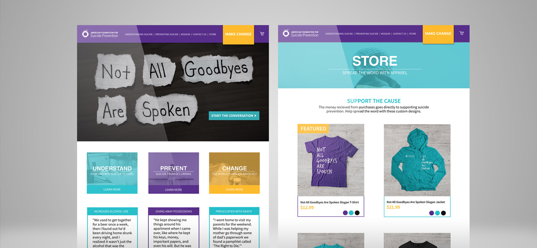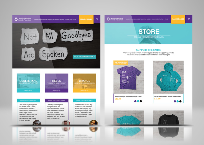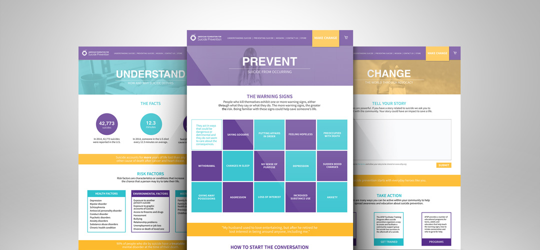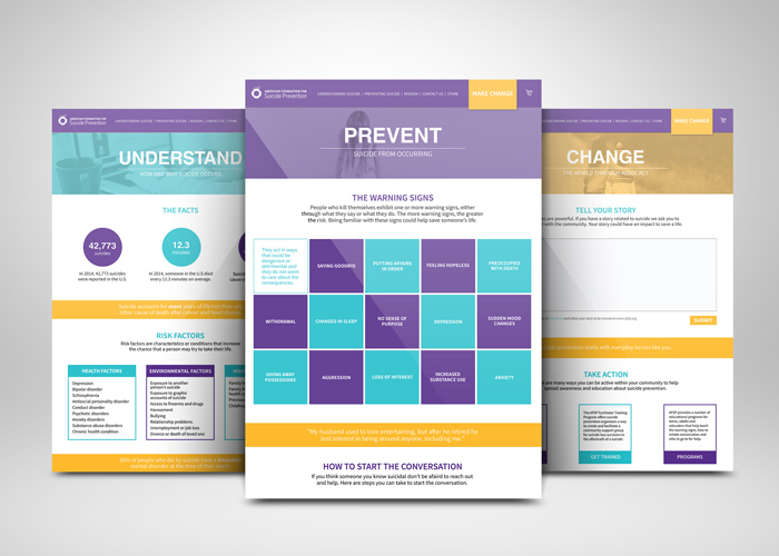 Anyone can prevent suicide if they’re given the right tools. With the use of clear navigation and easily digestible information, the user is guided through understanding how and why suicide occurs and presented with ways in which they can help prevent suicide. In addition, users are encouraged to inspire change through telling their own story, getting involved in community efforts, or purchasing merchandise.