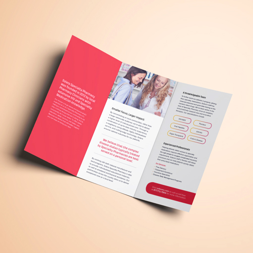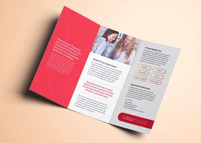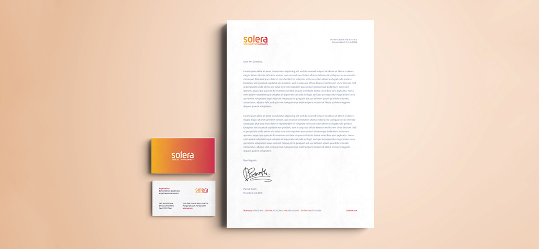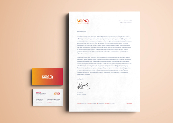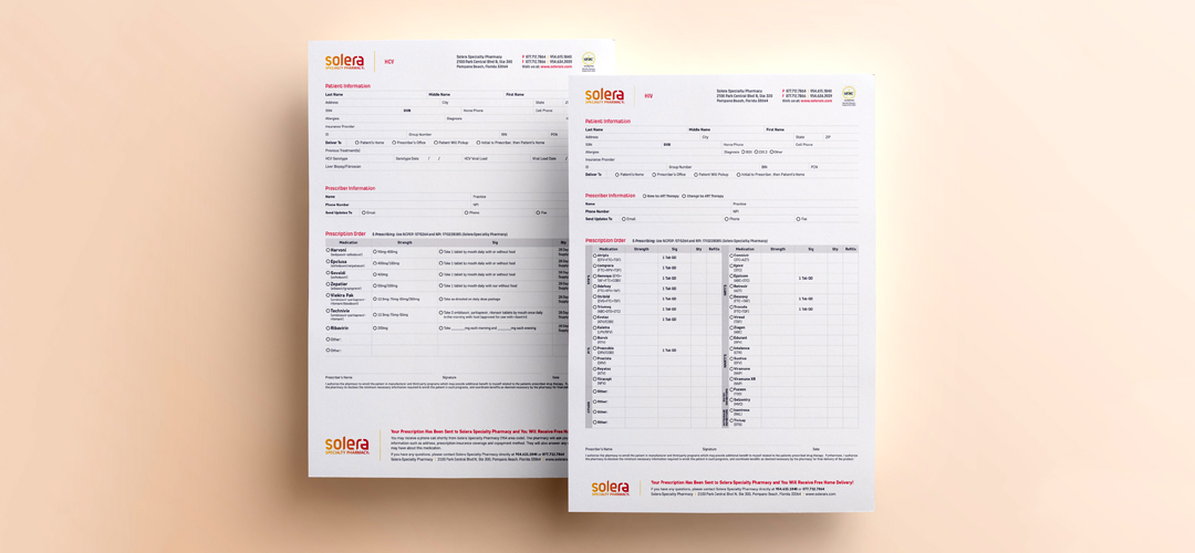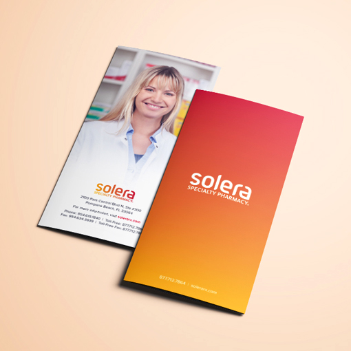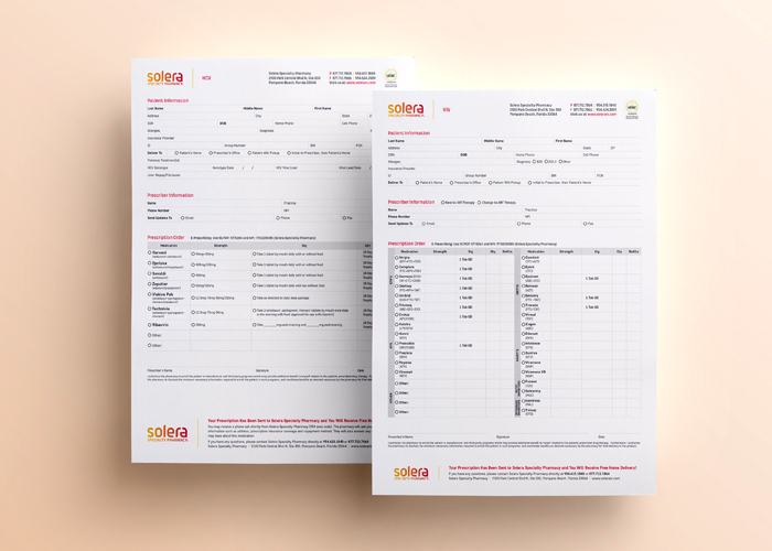 Solera Specialty Pharmacy is dedicated to providing exceptional and individualized care to their local community. As Production Artist, I designed custom interactive forms that are used by prescriber’s to request patient medication, a core services brochure to educate potential patients and prescriber’s about Solera’s expertise, and stationery such as business cards and letterhead. By utilizing clean, open layouts with intimate photography I created a professional and welcoming brand experience.